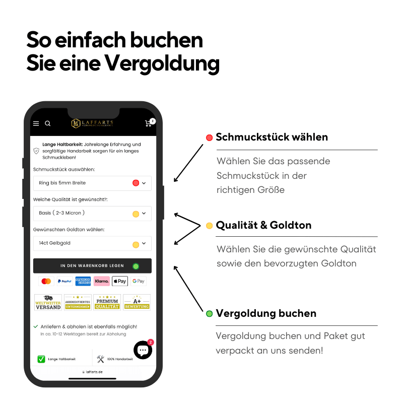 Choosing the right product: Choose the piece of jewelry you want to enhance from our central product category "Gold Plating Jewelry." Whether it's a ring, pendant, necklace, or bracelet—we have the right option for every type of jewelry. You can also decide on the desired coating thickness and gold tone.