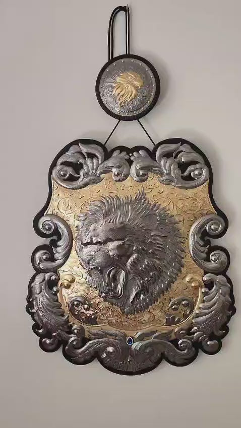 Dekorativer heraldischer Schild „Der Löwe“ Zweiseitiges Meisterstück von Sergey Filippenko